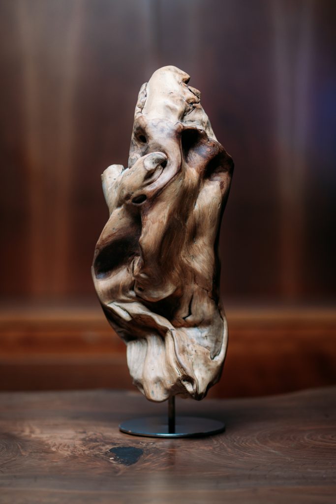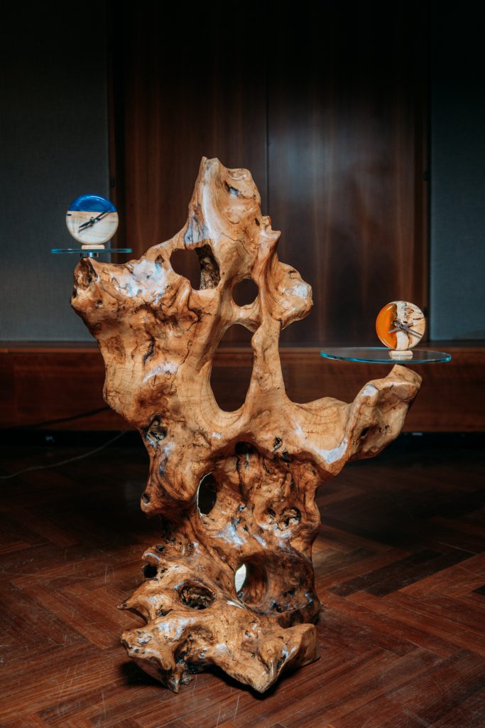 Tavoli, lampade, specchi, espositori, sculture e complementi d’arredo vengono progettati e realizzati uno per uno, valorizzando ogni imperfezione del legno e trasformandola in carattere. Ogni progetto ha un’anima propria, un nome ispirato alla mitologia o alla natura, e una forte identità estetica.